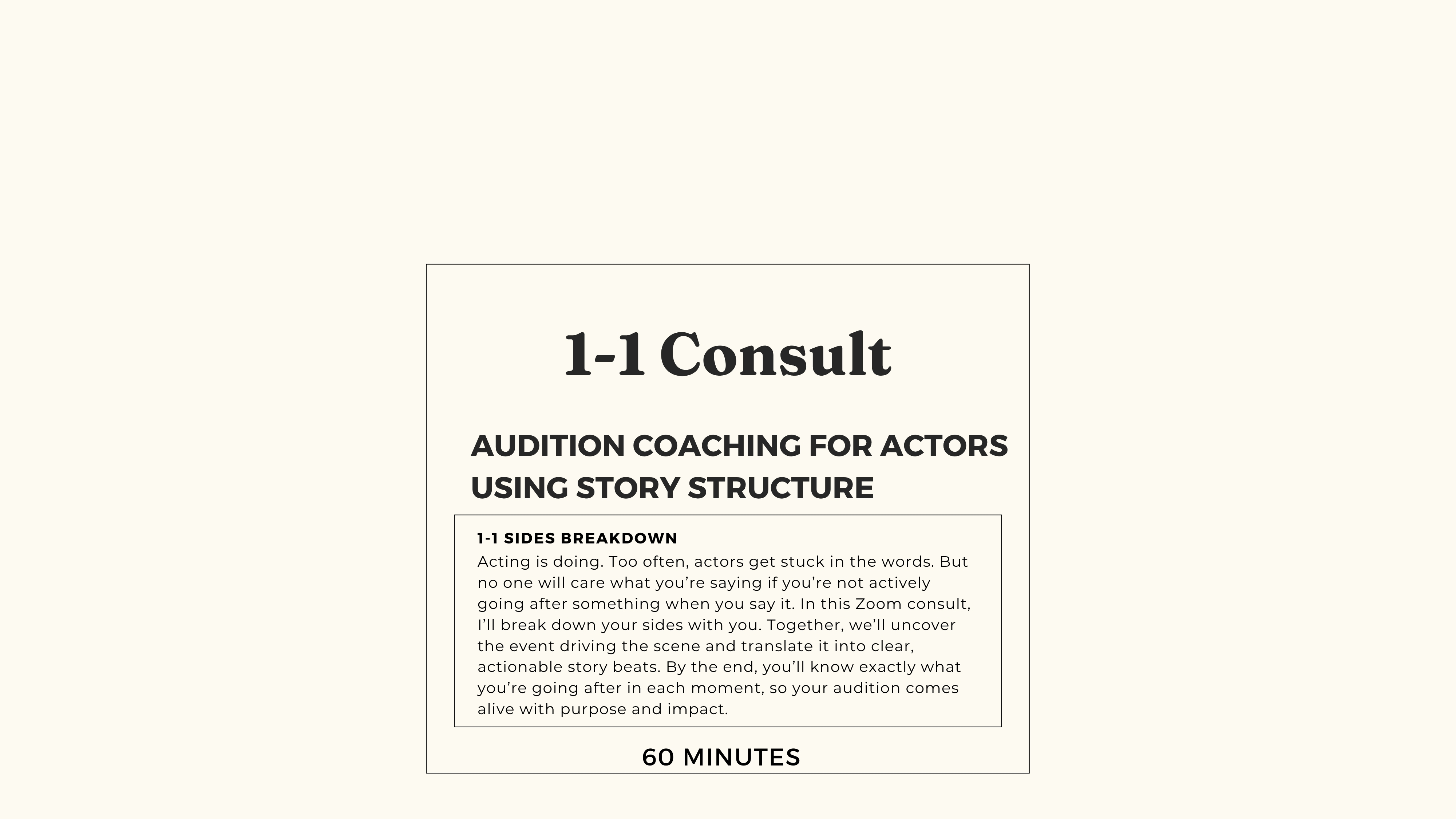 Acting is doing. Too often, actors get stuck in the words. But no one will care what you’re saying if you’re not actively going after something when you say it. In this Zoom consult, I’ll break down your sides with you. Together, we’ll uncover the event driving the scene and translate it into clear, actionable story beats. By the end, you’ll know exactly what you’re going after in each moment, so your audition comes alive with purpose and impact.